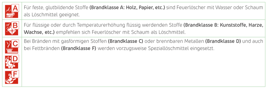 Diese müssen unter Berücksichtigung der Betriebsart und der Brandgefährdung sowie der Größe des zu schützenden Bereiches in ausreichender Anzahl bereitgestellt sein. Wichtig ist zudem die Anforderung, dass Feuerlöscher für ihren Einsatzzweck geeignet sind. Die Auswahl des geeigneten Löschmittels und die Berechnung der erforderlichen Anzahl der Feuerlöscher sowie die Anforderungen für die durchzuführenden regelmäßigen Prüfungen sind in der Technischen Richtlinie DIN EN 3 “Tragbare Feuerlöscher” sowie in der VdS 2001 „Regeln für die Ausrüstung von Arbeitsstätten mit Feuerlöschern“ beschrieben.